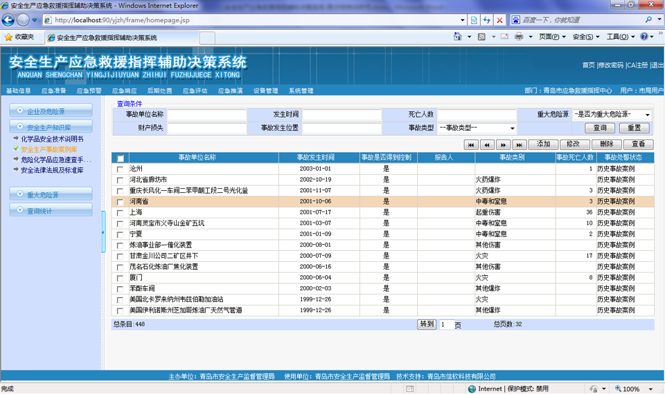 以醒目的報(bào)表形式,對(duì)重大危險(xiǎn)源分布、監(jiān)管企業(yè)、危險(xiǎn)物質(zhì)、應(yīng)急資源進(jìn)行統(tǒng)計(jì)列表展示,并支持多層次頁面鏈接方式查詢與瀏覽重大危險(xiǎn)源、企業(yè)綜合信息,支持鉆取功能。并在此基礎(chǔ)上進(jìn)行數(shù)據(jù)挖掘和深入分析,查詢結(jié)果既可以顯示為原始的文本數(shù)據(jù)也可以分類統(tǒng)計(jì)總和,提供柱狀、餅狀等各種形式的圖形。