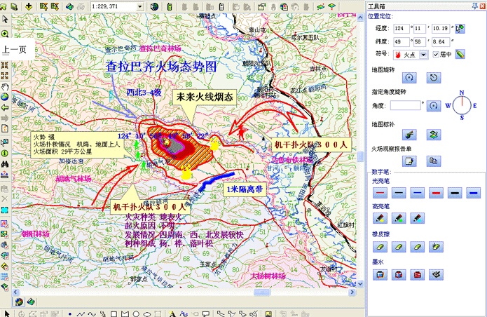 偵查標(biāo)繪系統(tǒng)可采集GPS信號(hào),實(shí)現(xiàn)了在電子地圖上進(jìn)行實(shí)時(shí)領(lǐng)航。觀察員可隨時(shí)在屏幕上看到自己的位置、坐標(biāo)、航跡、 航線、航向、高度、速度、偏航距離等領(lǐng)航信息,又可直觀地在電子地圖上看到所在位置周圍的地物、地貌信息。標(biāo)繪系統(tǒng)方便簡(jiǎn)單的操作步驟,更適合實(shí)戰(zhàn)應(yīng)用。同樣,救援隊(duì)伍亦可隨時(shí)知道自己的準(zhǔn)確地理位置,并且指揮員可以利用GPRS和CDMA無線網(wǎng)絡(luò),將標(biāo)繪好的火場(chǎng)態(tài)勢(shì)圖和文字形式的火情報(bào)告及時(shí)上傳到上級(jí)應(yīng)急指揮部門。