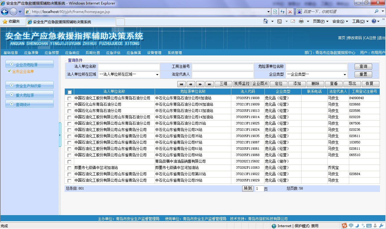?  對存在危險(xiǎn)源的企業(yè)進(jìn)行管理和查詢,可以按地區(qū)、經(jīng)濟(jì)類型、所屬行業(yè)等支持多種查詢條件進(jìn)行綜合查詢,查詢結(jié)果提供企業(yè)和所屬危險(xiǎn)源的具體信息、以樹形結(jié)構(gòu)展示單位基本情況、及其附屬的安全評價(jià)、行政許可等分類信息,方便政府主管部門查看危險(xiǎn)源企業(yè)的各種動態(tài)情況。可以在線查詢調(diào)閱危險(xiǎn)源視頻監(jiān)控信息、三維模型信息、GIS詳細(xì)信息,企業(yè)及危險(xiǎn)源信息可以導(dǎo)出到excel或者word中。