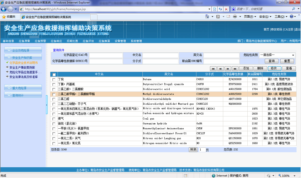 按照GB 16483-2000 化學(xué)品安全技術(shù)說明書編寫規(guī)定】進(jìn)行危險(xiǎn)化學(xué)品信息采編,并導(dǎo)入常見化學(xué)品3000多條數(shù)據(jù)。