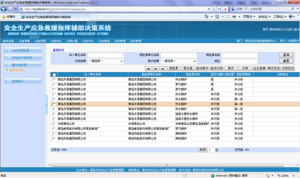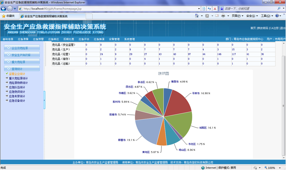 以醒目的報(bào)表形式,對重大危險(xiǎn)源分布、監(jiān)管企業(yè)、危險(xiǎn)物質(zhì)、應(yīng)急資源進(jìn)行統(tǒng)計(jì)列表展示,并支持多層次頁面鏈接方式查詢與瀏覽重大危險(xiǎn)源、企業(yè)綜合信息,支持鉆取功能。并在此基礎(chǔ)上進(jìn)行數(shù)據(jù)挖掘和深入分析,查詢結(jié)果既可以顯示為原始的文本數(shù)據(jù)也可以分類統(tǒng)計(jì)總和,提供柱狀、餅狀等各種形式的圖形。