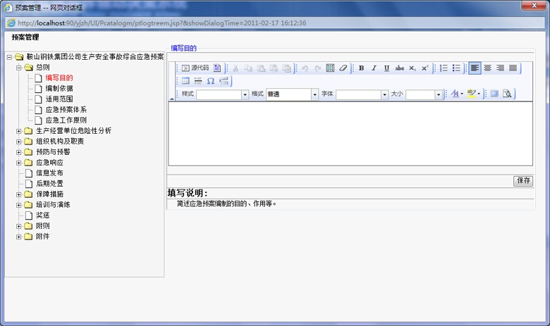 應(yīng)急預(yù)案有綜合應(yīng)急預(yù)案、專項(xiàng)應(yīng)急預(yù)案、現(xiàn)場處置方案構(gòu)成,由于綜合預(yù)案、專項(xiàng)預(yù)案、現(xiàn)場處置預(yù)案的目錄和編制內(nèi)容并不相同,在編制預(yù)案時(shí),編制人員可隨時(shí)讀取預(yù)案模板或案例進(jìn)行參考,系統(tǒng)并可提示幫助信息,輔助完成預(yù)案的編制、修訂。