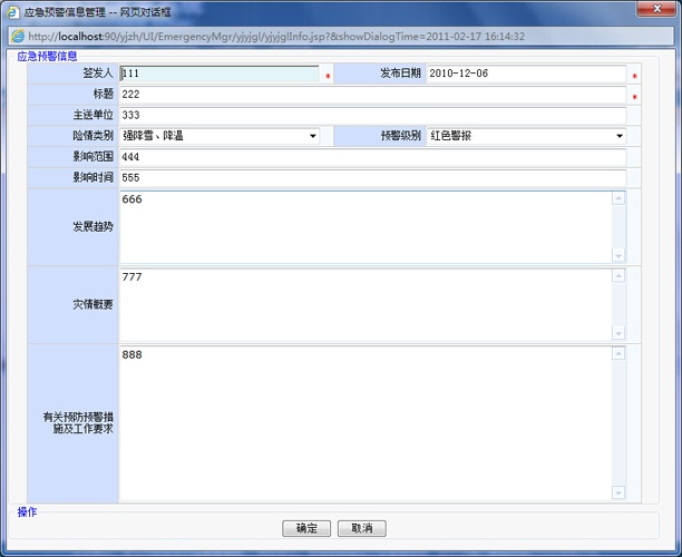根據(jù)青島市發(fā)布的預(yù)警信息并結(jié)合安監(jiān)局業(yè)務(wù),提前發(fā)布一些預(yù)警信息或通過電話、傳真、手機(jī)、短信等方式,獲取預(yù)警信息。預(yù)警信息需要根據(jù)事態(tài)的進(jìn)一步發(fā)展核實(shí)后,根據(jù)系統(tǒng)權(quán)限,向應(yīng)急事件可能涉及的區(qū)域發(fā)布,當(dāng)預(yù)警結(jié)束后解除預(yù)警。