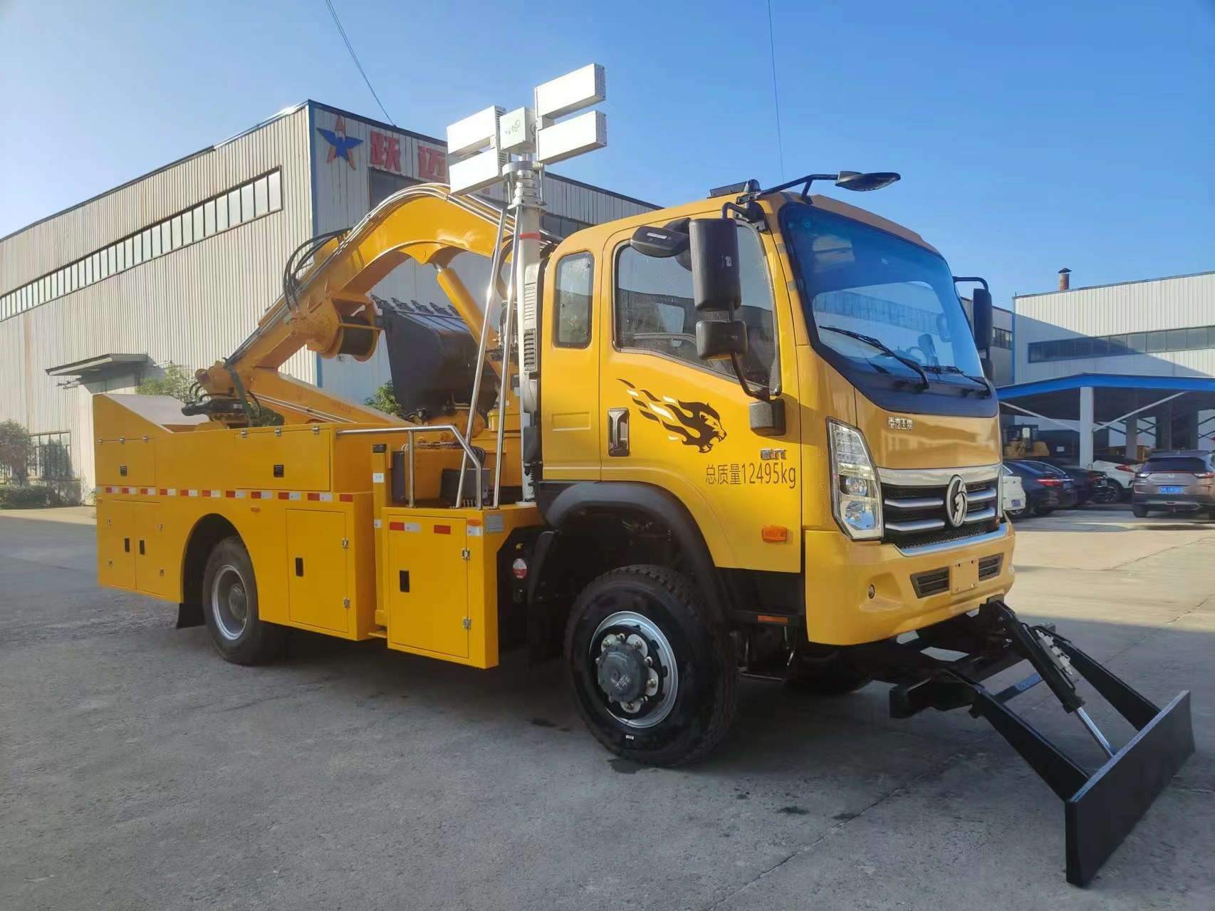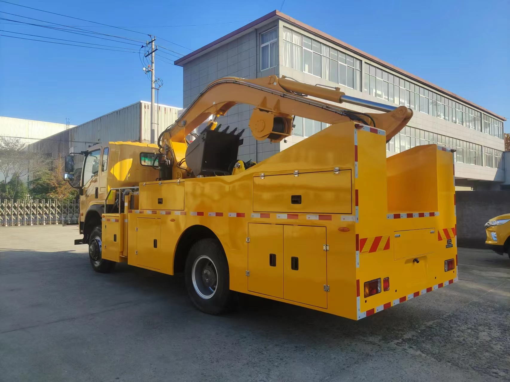 車輛配備舉升臂架、挖斗、破拆錘、抓斗、推鏟、牽引絞盤、發(fā)電機組、升降照明燈等搶險裝備,實現(xiàn)多種場景的救援作業(yè);