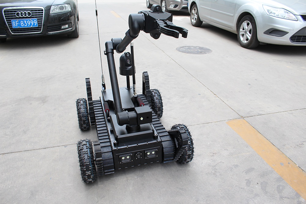 機(jī)械臂部分配備爆炸物銷毀器、瞄準(zhǔn)器,能現(xiàn)場(chǎng)對(duì)爆炸物進(jìn)行摧毀;