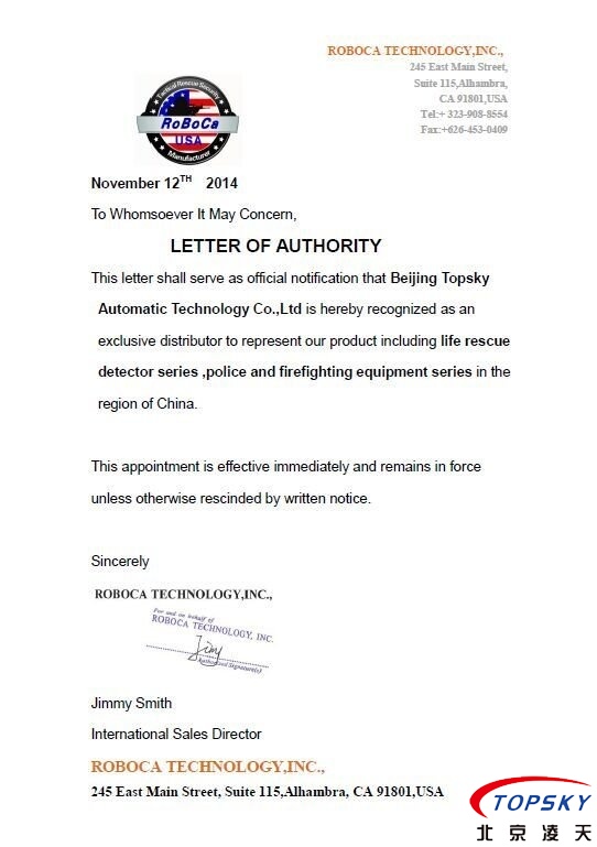 北京凌天成為美國ROBOCA公司在亞太區(qū)的總代理, 美國ROBOCA公司是反恐,救援裝備的制造商,主要產(chǎn)品包括氣動支撐系統(tǒng),雷達(dá)生命探測儀,排爆機器人等.