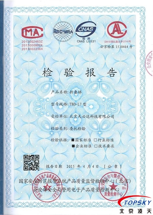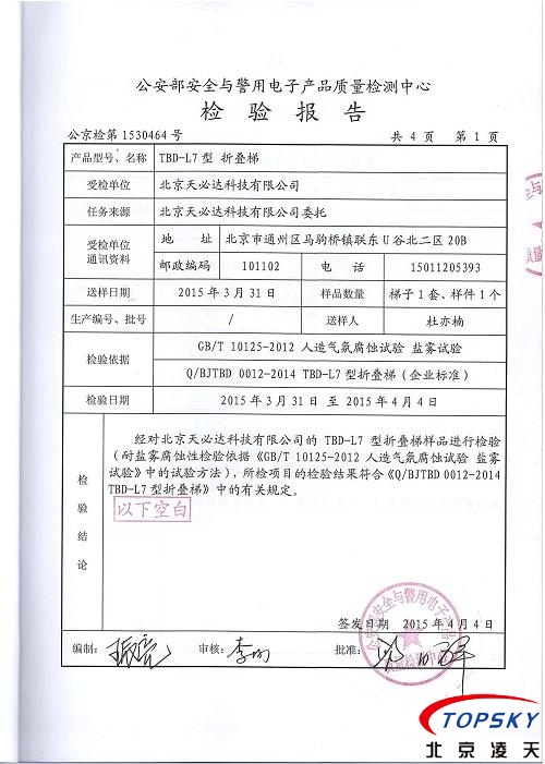 近日,北京天必達(dá)科技有限公司研發(fā)的TBD-L7便攜式折疊梯通過公安部安全與電子產(chǎn)品檢測(cè)檢驗(yàn)中心檢驗(yàn),檢測(cè)報(bào)告編號(hào):公京檢第1530464號(hào)。