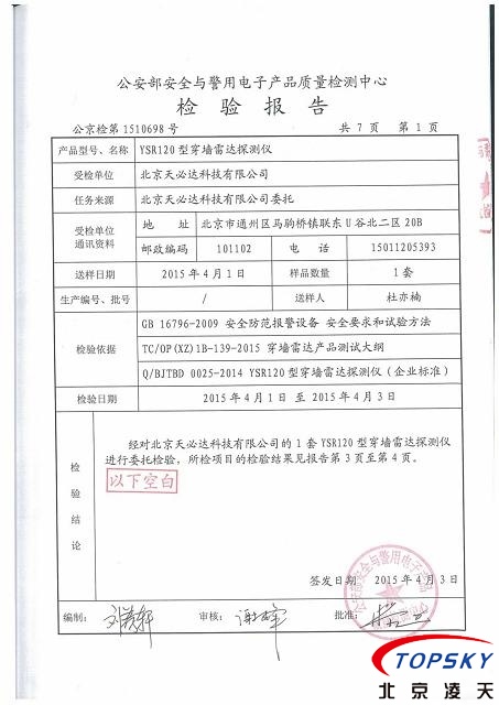 近日,北京天必達(dá)科技有限公司研發(fā)的YSR-120穿墻雷達(dá)探測(cè)儀通過公安部安全與電子產(chǎn)品檢測(cè)檢驗(yàn)中心檢驗(yàn),檢測(cè)報(bào)告編號(hào):公京檢第1510698號(hào)。