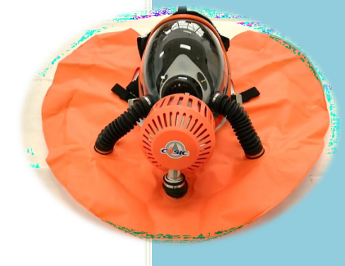 遇到緊急情況或者需要隔絕式防護的應急場合,使用人員應按佩戴的要求迅速戴上呼吸面罩,并根據個人臉型調整呼吸面罩上的緊固帶松緊程度,并佩戴緊固。人員呼出的低氧氣含量(17%左右)、高二氧化碳含量(4.5%左右)的氣體通過呼吸面罩的單向出氣口進入空氣再生罐。在空氣再生罐內,呼出氣體中的二氧化碳與生氧劑發(fā)生化學反應產生氧氣。當呼出氣體從空氣再生罐經呼吸軟管流入氣囊時已置換成新鮮空氣。新鮮空氣儲存在氣囊中,人體吸氣時產生負壓,新鮮空氣分別沿氣囊左右兩側的呼吸軟管流回面罩內,完成一次空氣循環(huán)再生;并依次往復循環(huán)下去,連續(xù)不斷地提供人體呼吸所需的新鮮空氣。