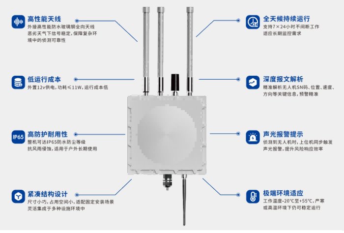 1.該產(chǎn)品是一款集成多種通信模式和能源供應(yīng)的智能無(wú)人機(jī)探測(cè)設(shè)備,采用外置玻璃鋼全向天線,可以對(duì)市面上常見消費(fèi)級(jí)無(wú)人機(jī)實(shí)現(xiàn)精準(zhǔn)預(yù)警;