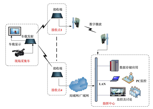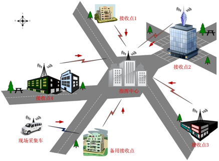 前端現(xiàn)場(chǎng)采集車安裝大功率車載設(shè)備在城市各區(qū)內(nèi)巡邏,實(shí)時(shí)將采集的音視頻信息傳給就近接收點(diǎn),接收點(diǎn)用微波、光纖或?qū)>W(wǎng)等設(shè)施傳輸給指揮中心。