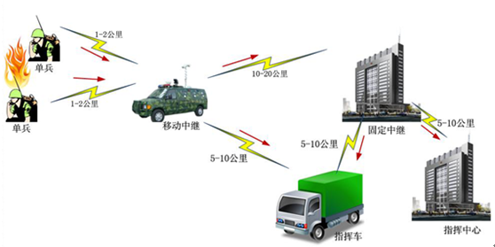 前端人員背負(fù)單兵設(shè)備采集音視頻信號(hào)傳給移動(dòng)中繼車,車上的接收合并采集信息后并對(duì)接車載(中繼)設(shè)備。由中繼接力發(fā)射 ,從而形成約30公里左右距離的 應(yīng)急通信鏈路,直至指揮中心。
